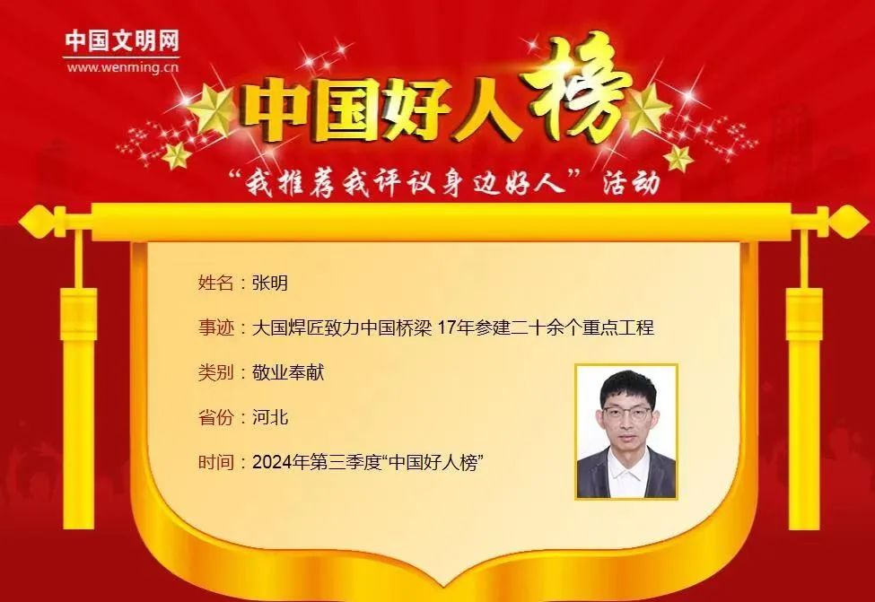 11月12日,中央精神文明建設(shè)辦公室主辦的2024年第三季度“中國好人榜”公布,中鐵山橋焊接特級技師張明入選2024年第三季度敬業(yè)奉獻(xiàn)“中國好人榜”榜單。